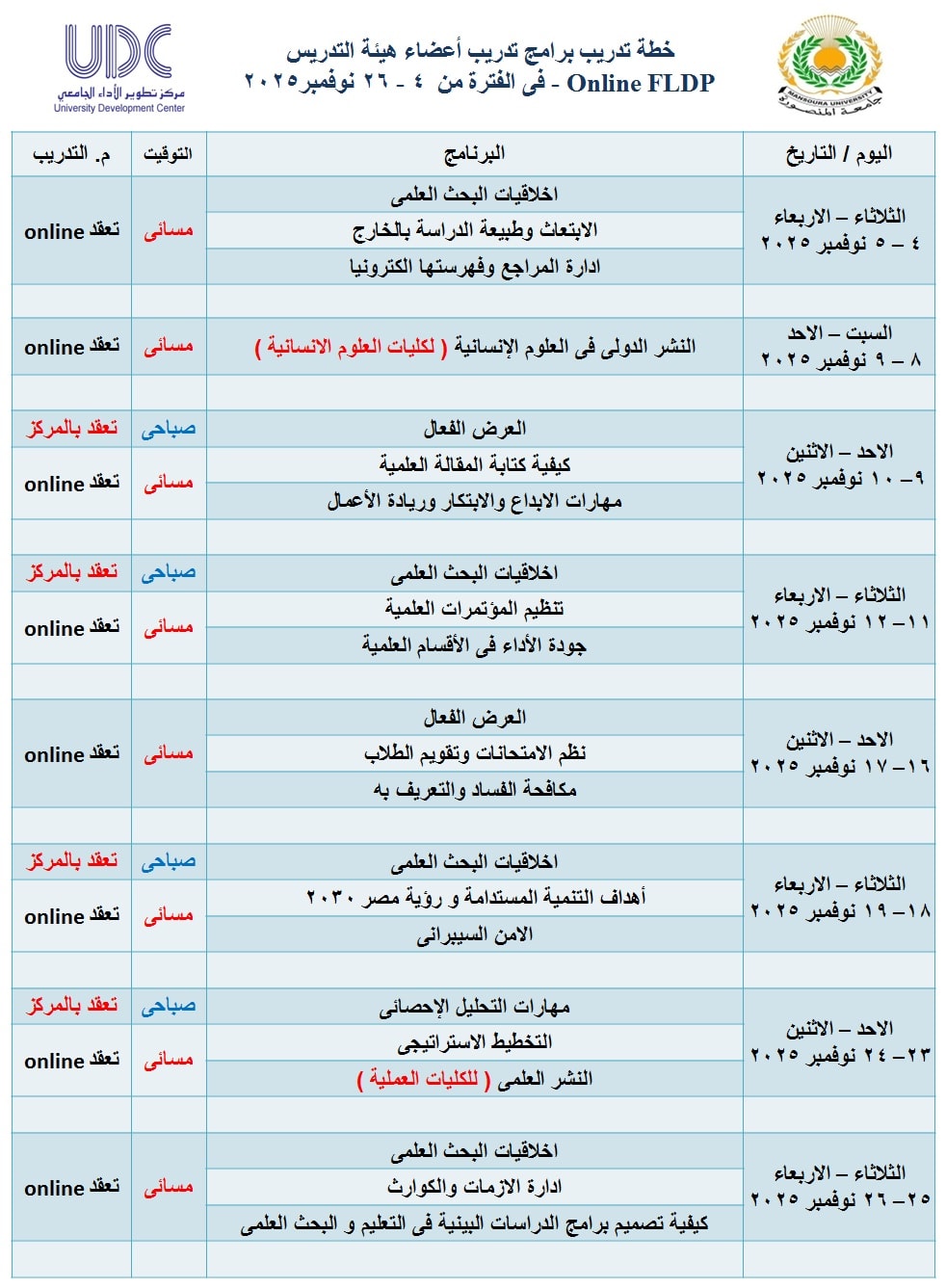 خطة تدريب برامج تدريب السادة أعضاء هيئة التدريس و السادة الباحثين فى الفترة من ٤- ٢٦ نوفمبر ٢٠٢٥