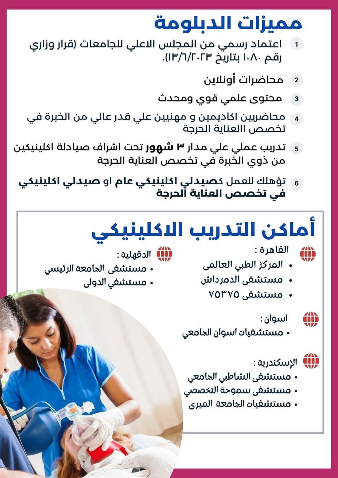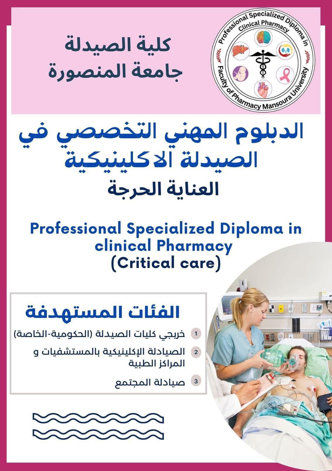 تعلن كلية الصيدلة جامعه المنصورة عن فتح باب التقدم لبرنامج الدبلوم المهني التخصصي في الصيدلة الاكلينيكية (العناية الحرجة) للعــــــــام الجــــامعي ٢٠٢٦/٢٠٢٥