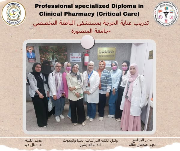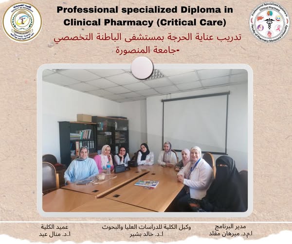 تحت رعاية الاستاذ الدكتور/ منال عيد عميد الكلية والاستاذ الدكتور خالد بشير وكيل الكلية لشئون الدراسات العليا والبحوث واشراف الاستاذ المساعد/ ميرهان مقلد المشرف علي برنامج الدبلوم المهني التخصصي في الصيدلة الإكلينيكية والدكتور/ امنية نور - منسق التدريب، تم تدريب طلاب الدفعة الثانية من برنامج الدبلوم المهني التخصصي في الصيدلة الإكلينيكية (تخصص العناية الحرجة) بقسم الكبد والسكر تحت اشراف