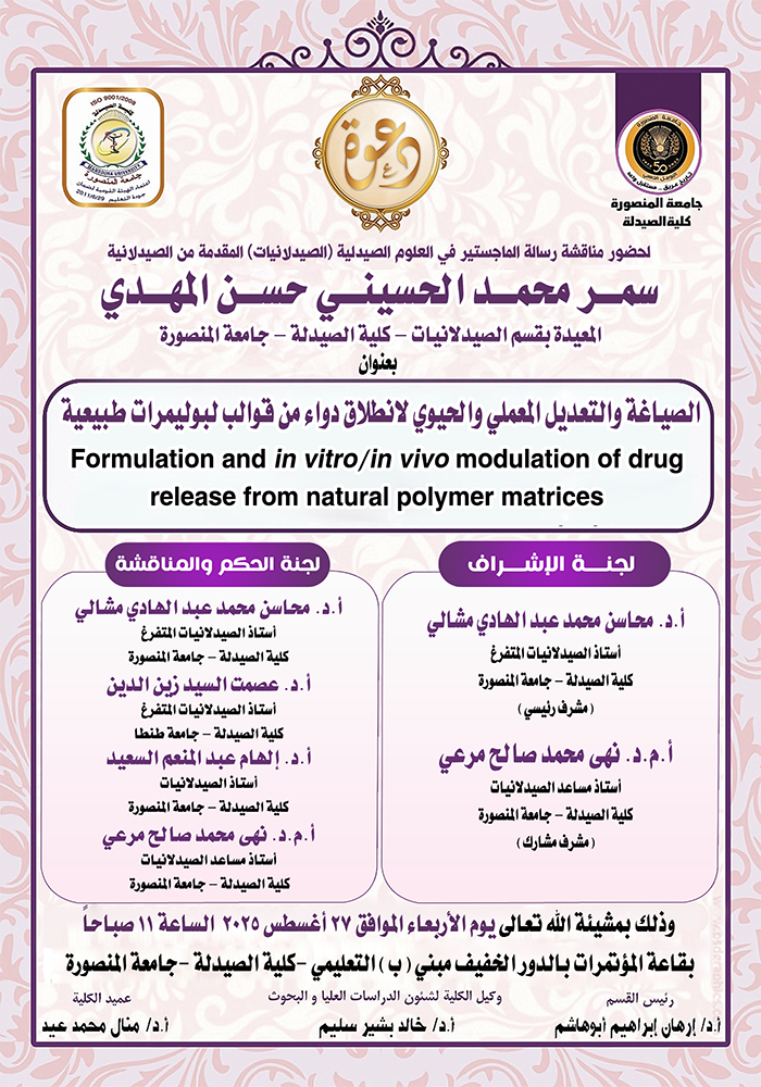 يارا محمد سليمان Hits: 217 مناقشة رسالة الماجستير فى العلوم الصيدلية (الصيدلانيات) المقدمة من الصيدلانية/ سمر محمد الحسينى حسن Next