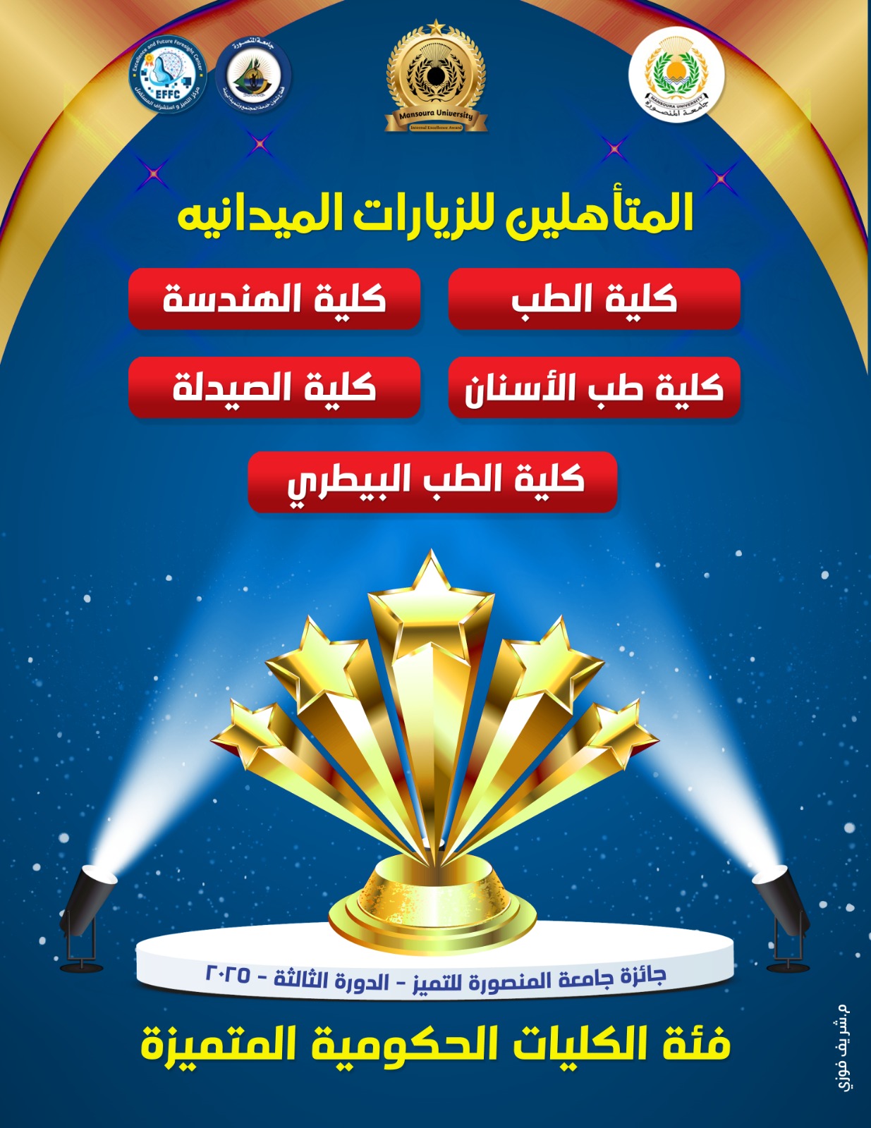 تُعلن جامعة المنصورة بالتعاون مع إدارة جائزة مصر للتميّز الحكومي عن الكليات المتأهلة لمرحلة الزيارات الميدانية ضمن