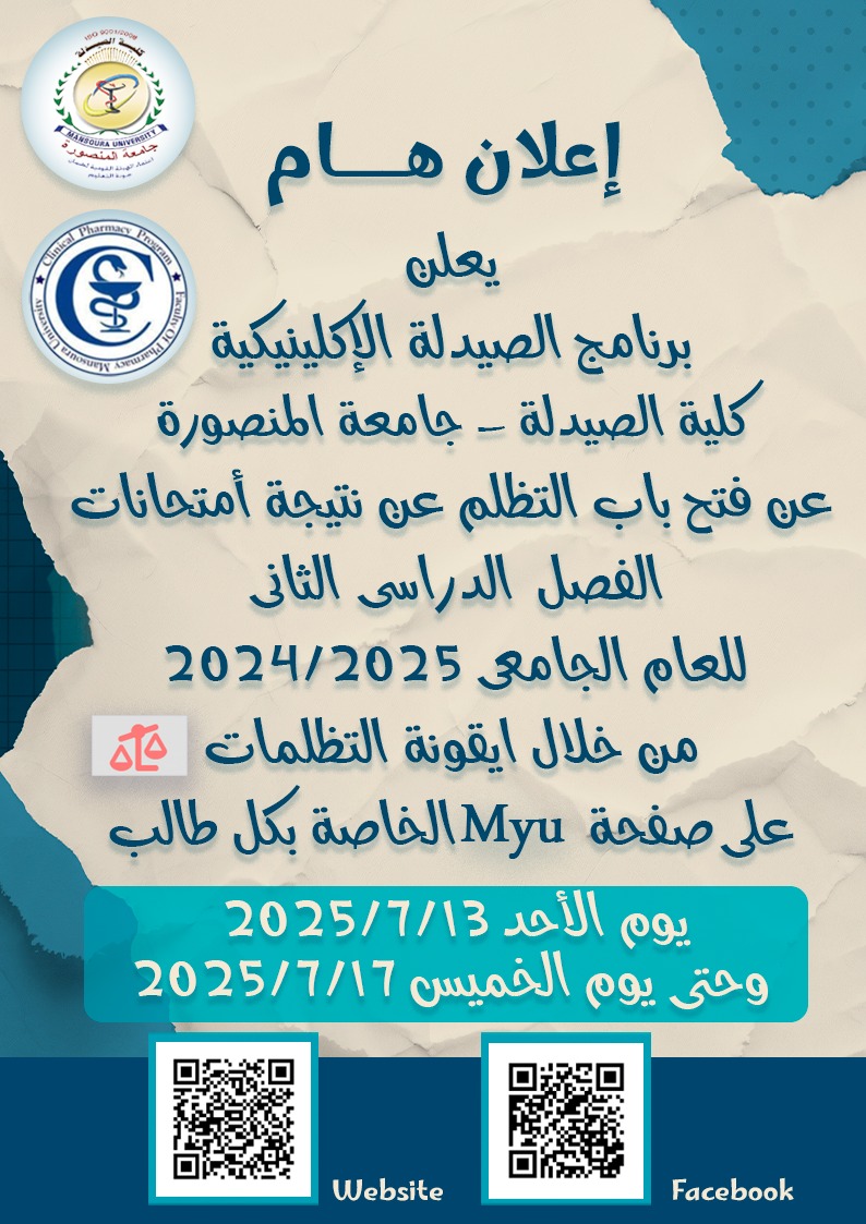 Previous Next 13 Jul,2025 م/ سها محمد عبد الدايم إعلاااان هام فتح باب التظلم عن نتيجة الفصل الدراسي الثاني 2024/2025 يعلن برنامج الصيدلة الإكلينيكية عن فتح باب التظلم عن نتيجة الفصل الدراسي الثاني 2024 /2025 من خلال ايقونة التظلمات على بورتال الطالب MYU بدءا من يوم الأحد 13/7/2025 وحتى يوم الخميس 17/7/2025 Prev Next
