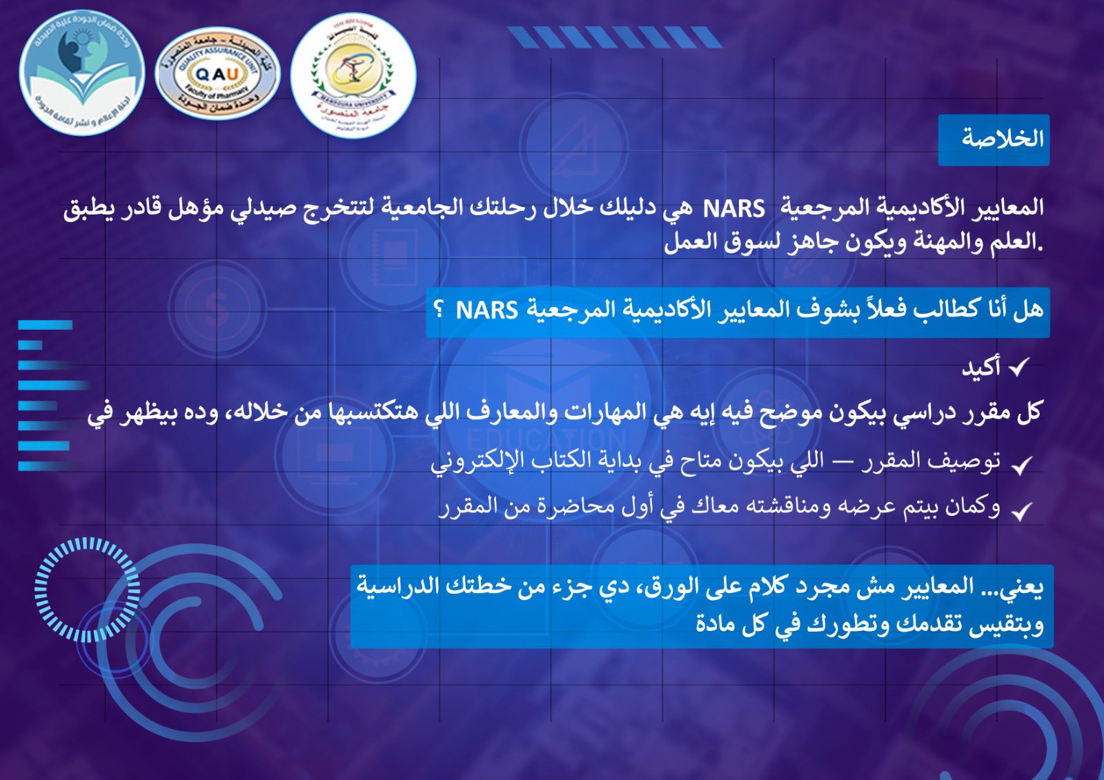 المعايير الأكاديمية المرجعية (NARS) هي دليلك خلال رحلتك الجامعية لتتخرج صيدلي مؤهل قادر يطبق العلم والمهنة ويكون جاهز لسوق العمل.