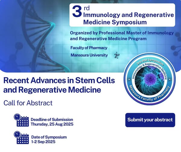 The 3rd immunology and regenerative medicine Symposium, organized by the Faculty of Pharmacy, Mansoura University, is pleased to invite all Stem Cell Investigators, Gene Therapy Researchers, Genetic Scientists, Regenerative Medicine Researchers, Cell biologists, Academic Professionals, Oncologists, and Immunologists to submit to submit their abstracts by August 25, 2025, for consideration.