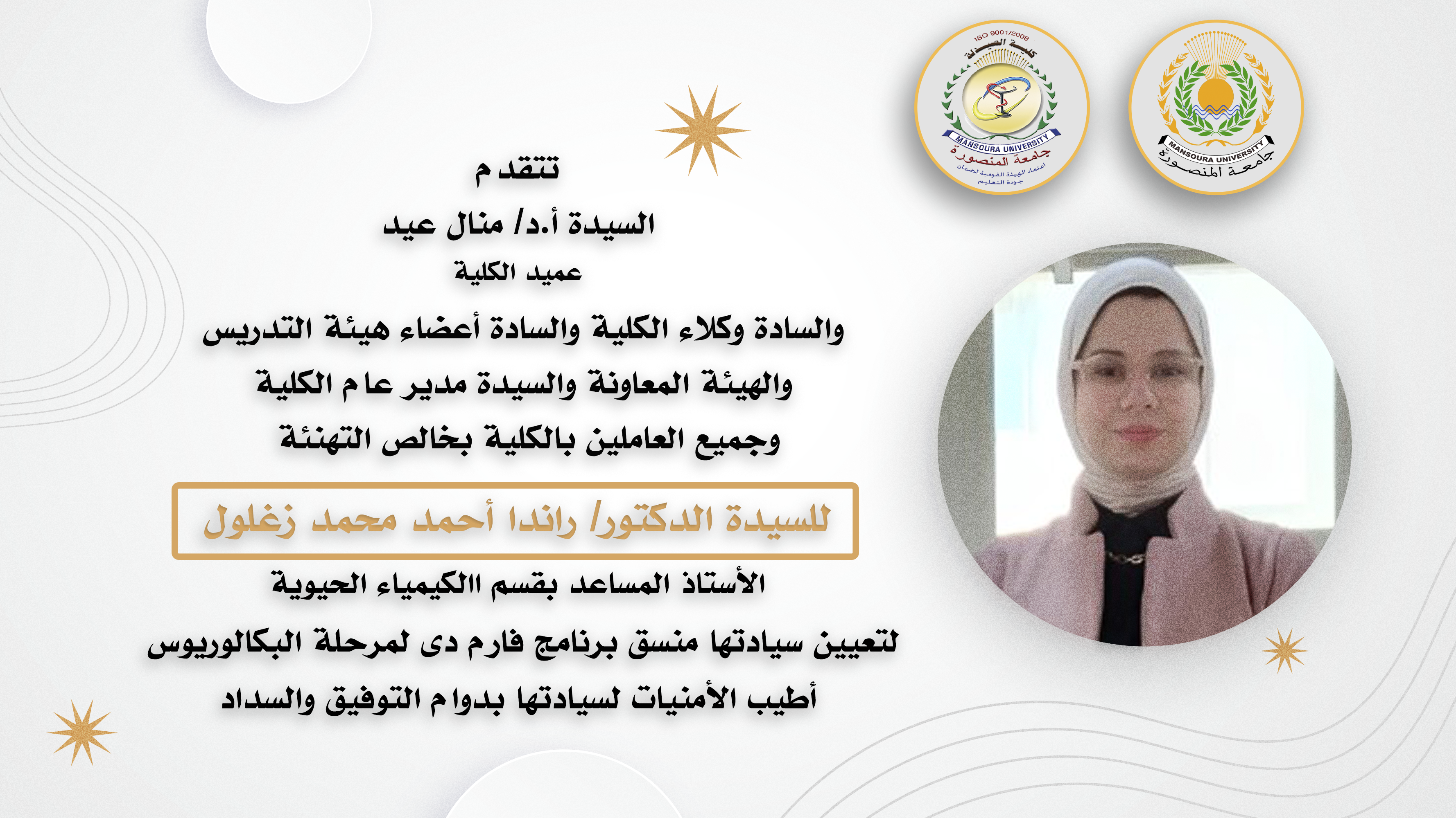 Previous Next 13 Aug,2025 يارا محمد سليمان Hits: 626 تهنئة تتقدم السيدة الأستاذ الدكتور/ منال عيد – عميد الكلية والسيد الأستاذ الدكتور/ خالد بشير – وكيل الكلية لشئون الدراسات العليا والبحوث والسيد الأستاذ الدكتور/ هانى قناوى – وكيل الكلية لشئون خدمة المجتمع وتنمية البيئة والسيدة الأستاذ الدكتور/ جينى جيهان نصر – وكيل الكلية لشئون التعليم والطلاب والسادة أعضاء هيئة التدريس والهيئة المعاونه والسيدة/ أمل عبد الجواد – مدير عام الكلية وجميع العاملين بالكلية بخالص التهنئة للسيدة الدكتور/ راندا أحمد محمد زغلول – الأستاذ المساعد بقسم الكيمياء الحيوية لتعيين سيادتها منسق برنامج فارم دى لمرحلة البكالوريوس أطيب الأمنيات لسيادتها بدوام التوفيق والسداد Prev Next