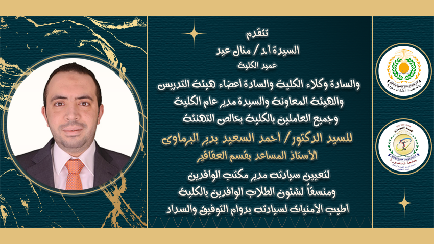 تتقدم السيدة الأستاذ الدكتور/ منال عيد – عميد الكلية والسيد الأستاذ الدكتور/ خالد بشير – وكيل الكلية لشئون الدراسات العليا والبحوث والسيد الأستاذ الدكتور/ هانى قناوى – وكيل الكلية لشئون خدمة المجتمع وتنمية البيئة والسيدة الأستاذ الدكتور/ جينى جيهان نصر – وكيل الكلية لشئون التعليم والطلاب والسادة أعضاء هيئة التدريس والهيئة المعاونه والسيدة/ أمل عبد الجواد – مدير عام الكلية وجميع العاملين بالكلية بخالص التهنئة للسيد الدكتور/ أحمد السعيد بدير البرماوى – الأستاذ المساعد بقسم العقاقير لتعيين سيادته مدير مكتب الوافدين ومنسقاً لشئون الطلاب الوافدين بالكلية.
