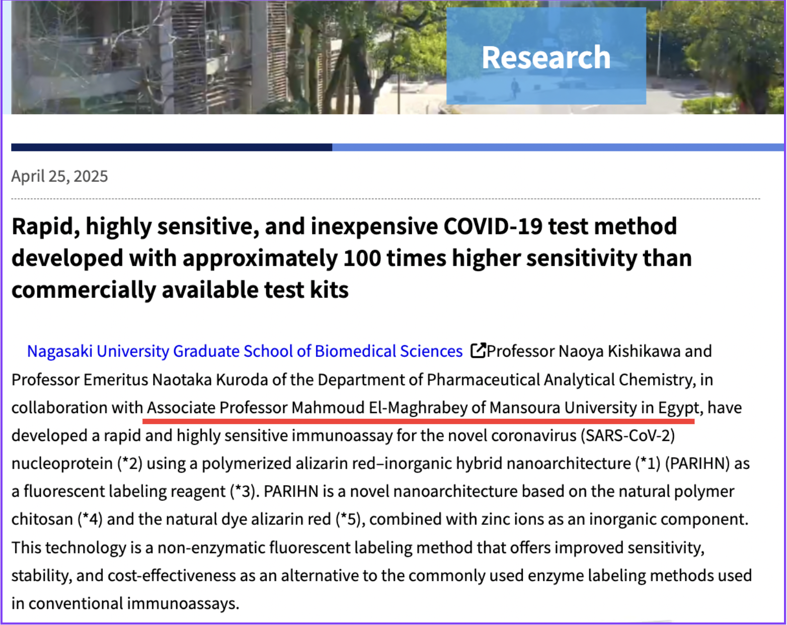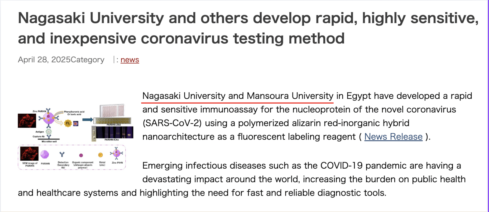 في خطوة جديدة تؤكد حضورها العلمي المتزايد على الساحة الدولية، شارك فريق بحثي من جامعة المنصورة في تطوير وسيلة مبتكرة للكشف عن فيروس كورونا، بالتعاون مع جامعة ناغازاكي اليابانية. ويُعد هذا الإنجاز ثمرة تعاون دولي متميز يجمع بين خبرات مصرية ويابانية في سبيل تطوير أدوات تشخيص أكثر دقة وسرعة وفعالية.