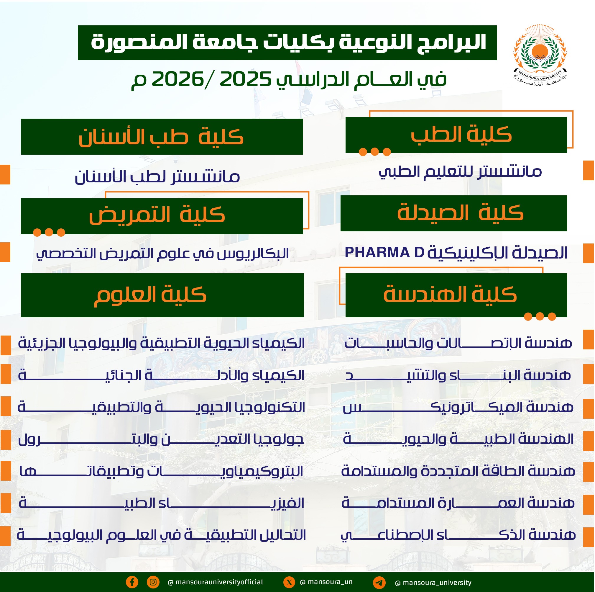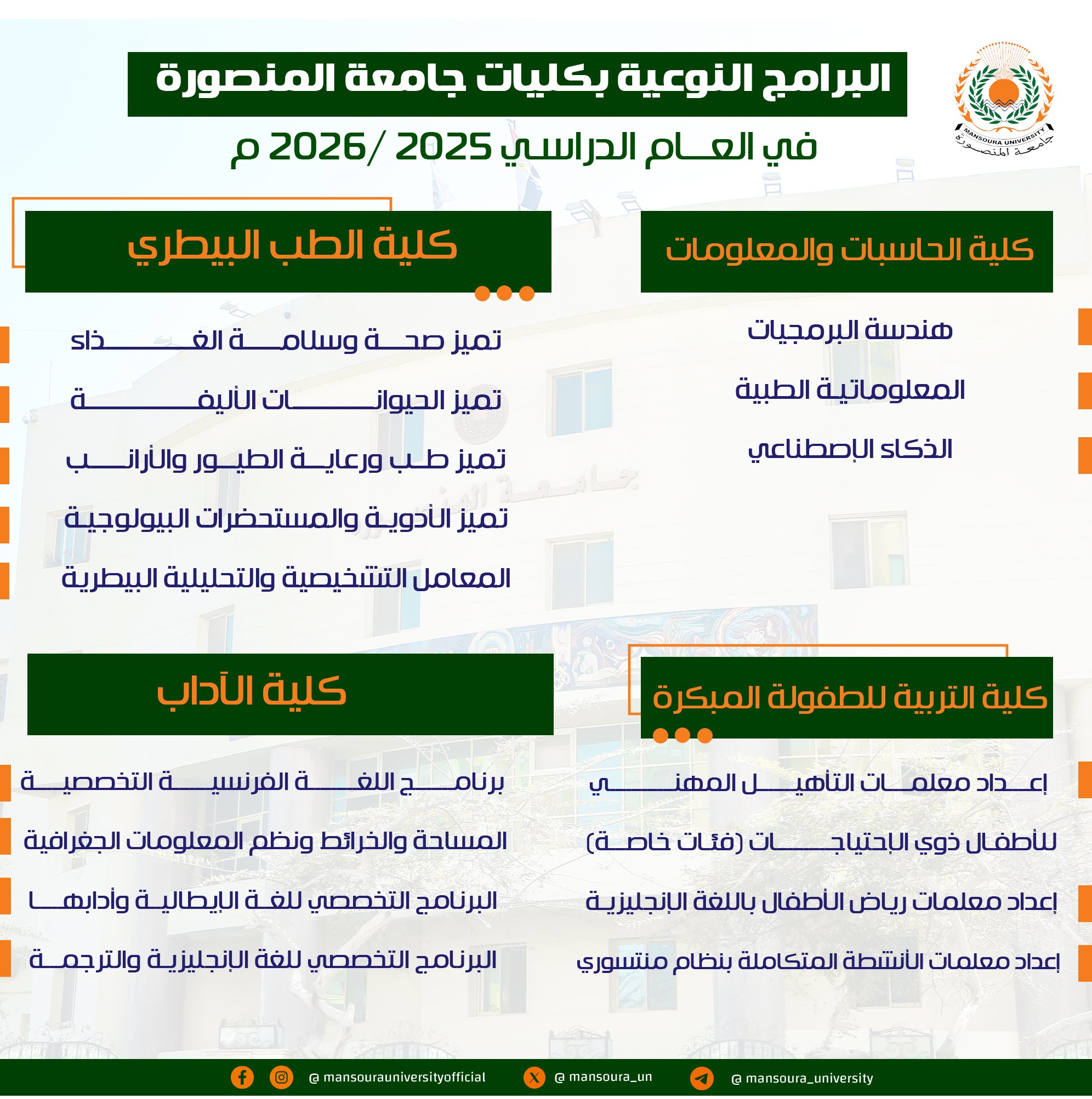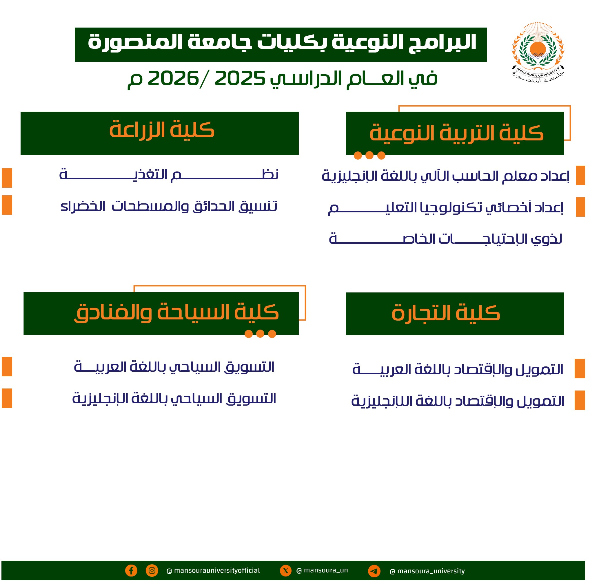 في إطار ريادتها الأكاديمية وسعيها الدائم لمواكبة متطلبات سوق العمل محليًا ودوليًا، تقدم جامعة المنصورة مجموعة من البرامج النوعية المتميزة داخل كلياتها، صُممت وفق أحدث المعايير الأكاديمية والتقنية، لتجمع بين التخصص العلمي الدقيق والمهارات العملية التي يحتاجها خريجو المستقبل.