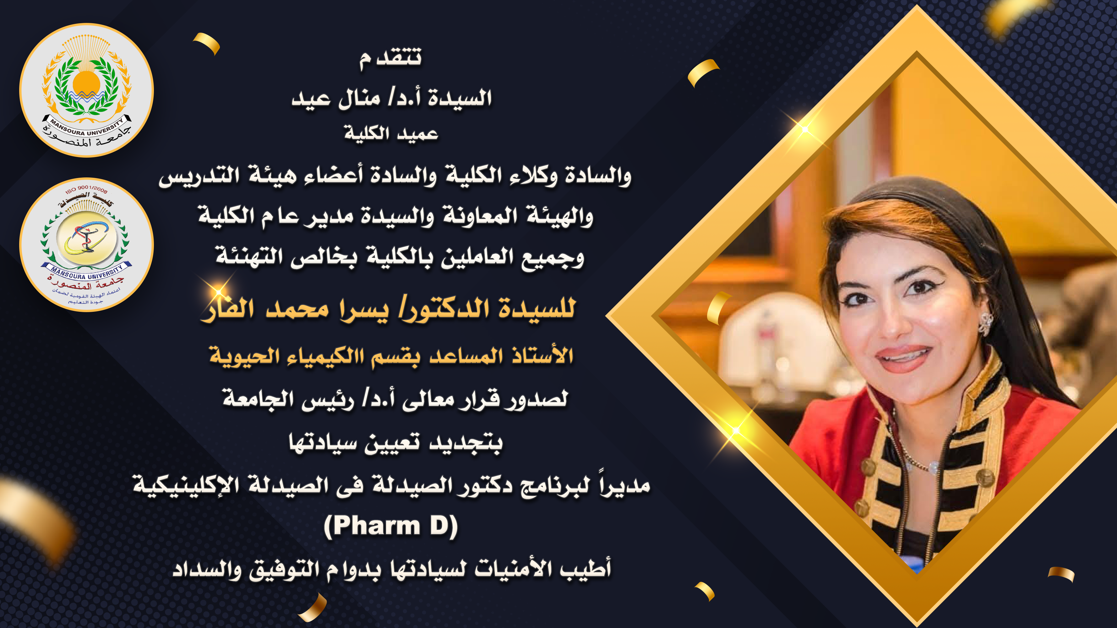 Previous Next 13 أغسطس,2025 يارا محمد سليمان الزيارات: 518 تهنئة تتقدم السيدة الأستاذ الدكتور/ منال عيد – عميد الكلية والسيد الأستاذ الدكتور/ خالد بشير – وكيل الكلية لشئون الدراسات العليا والبحوث والسيد الأستاذ الدكتور/ هانى قناوى – وكيل الكلية لشئون خدمة المجتمع وتنمية البيئة والسيدة الأستاذ الدكتور/ جينى جيهان نصر – وكيل الكلية لشئون التعليم والطلاب والسادة أعضاء هيئة التدريس والهيئة المعاونه والسيدة/ أمل عبد الجواد – مدير عام الكلية وجميع العاملين بالكلية بخالص التهنئة للسيدة الدكتور/ يسرا محمد الفار – الأستاذ المساعد بقسم الكيمياء الحيوية لصدور قرار معالى السيد الأستاذ الدكتور/ رئيس الجامعه بتجديد تعيين سيادتها مديراً لبرنامج دكتور الصيدلة فى الصيدلة الإكلينيكية Pharm D أطيب الأمنيات لسيادتها بدوام التوفيق والسداد السابق التالي
