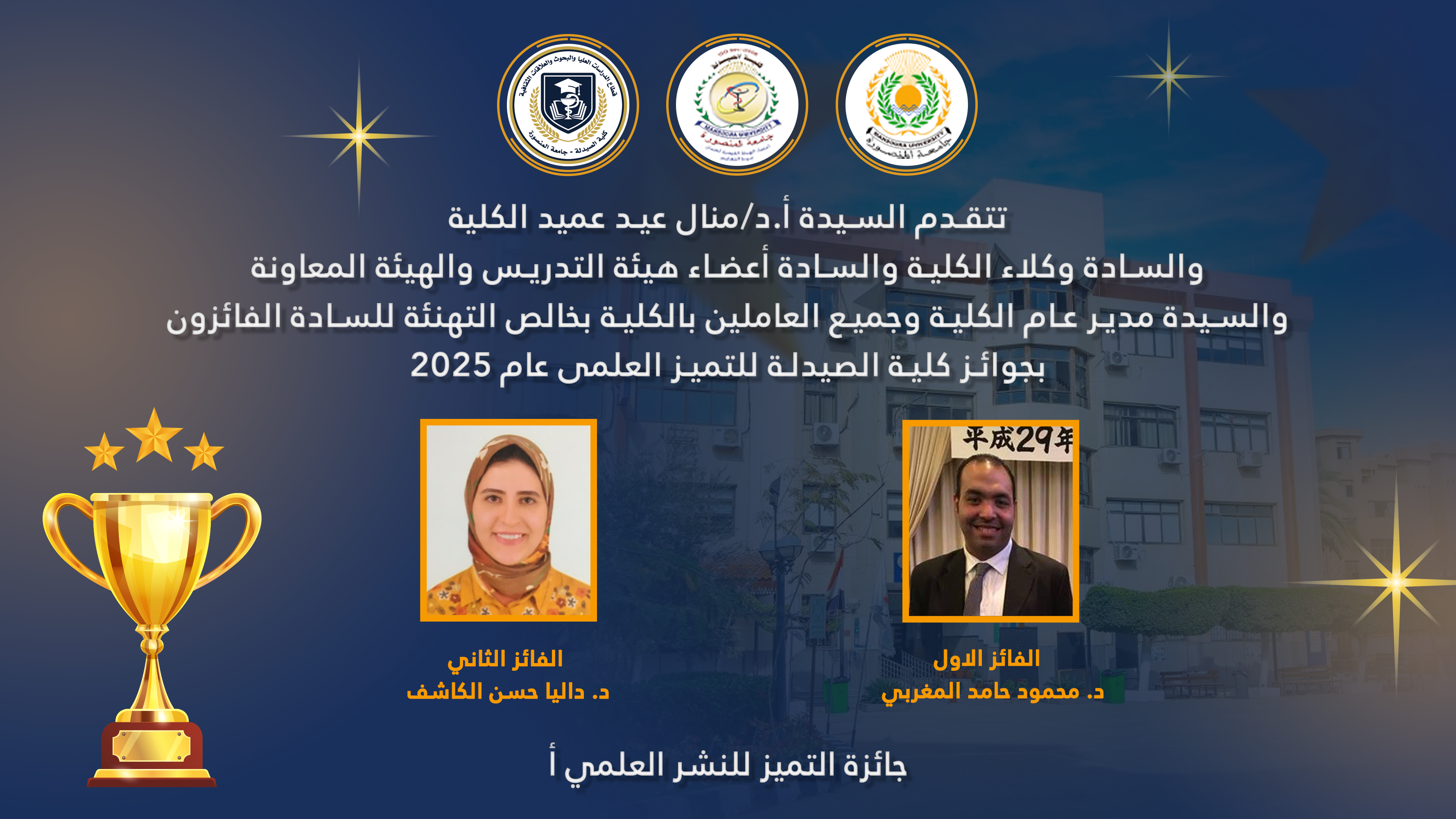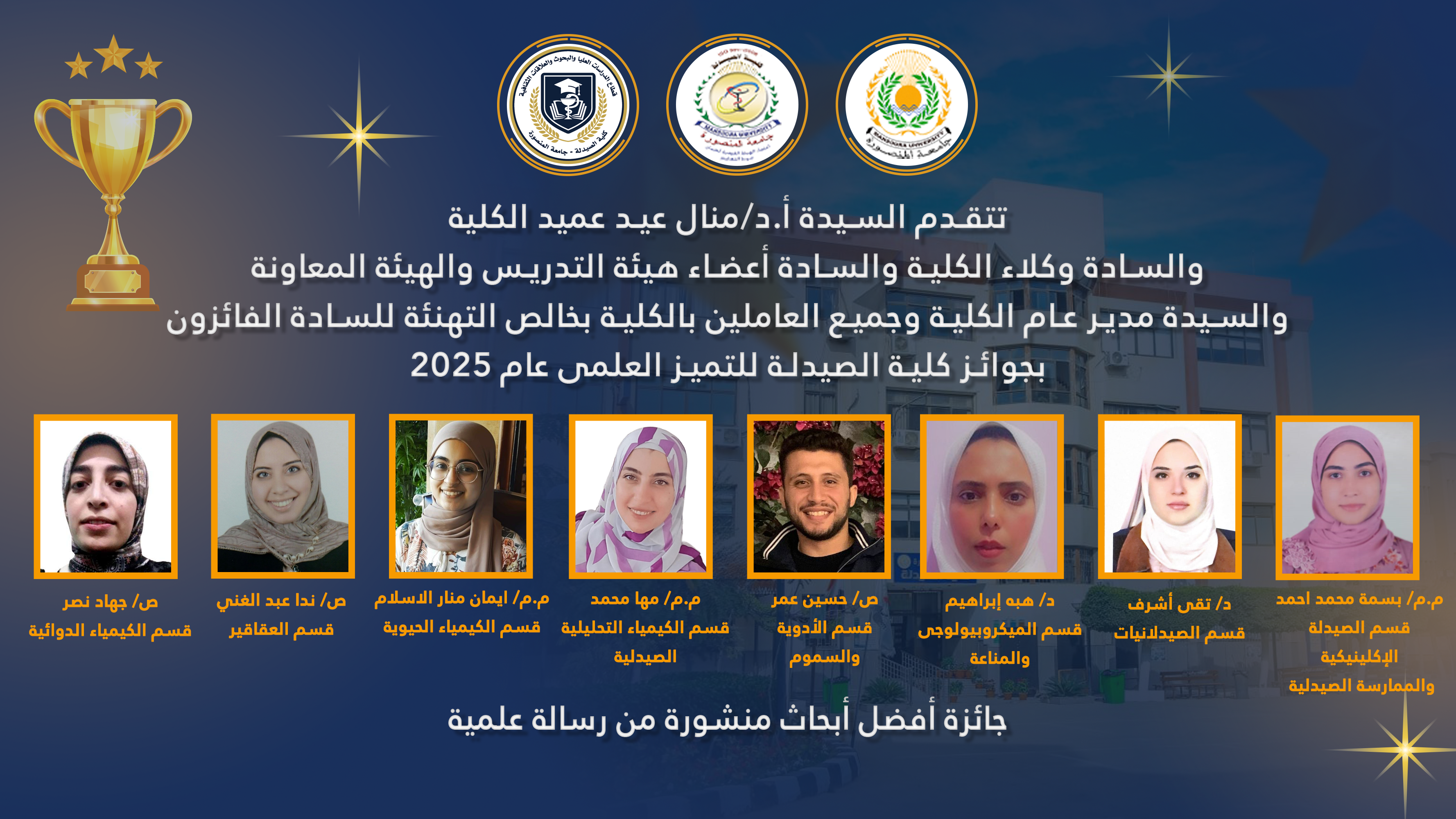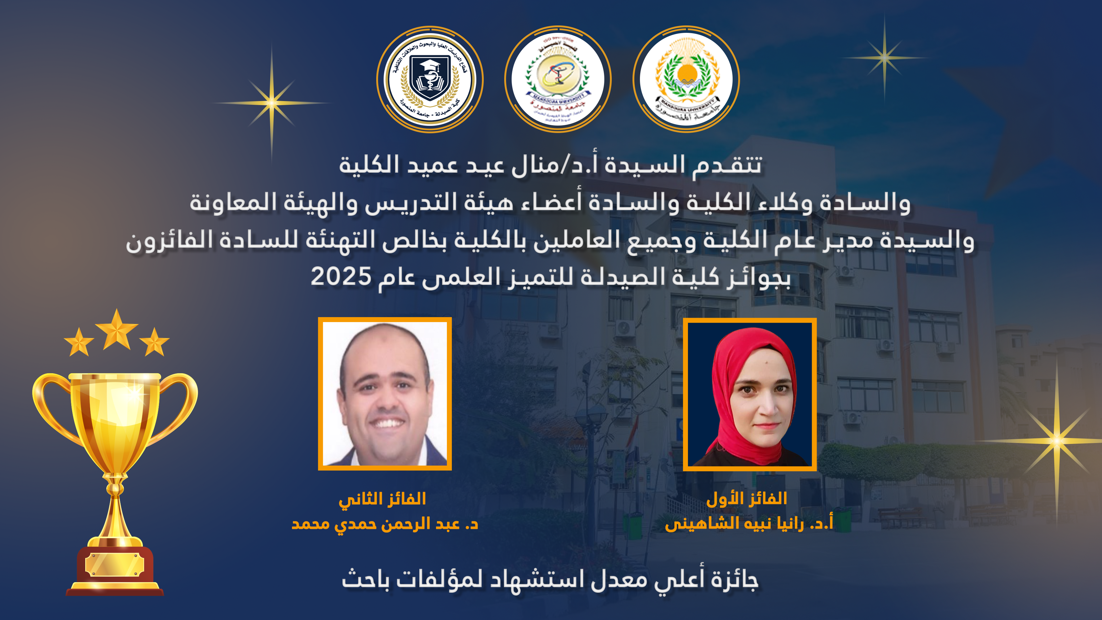 تتقدم السيدة الأستاذ الدكتور/ منال عيد – عميد الكلية والسيد الأستاذ الدكتور/ خالد بشير – وكيل الكلية لشئون الدراسات العليا والبحوث والسيد الأستاذ الدكتور/ هانى قناوى – وكيل الكلية لشئون خدمة المجتمع وتنمية البيئة والسيدة الأستاذ الدكتور/ جينى جيهان نصر – وكيل الكلية لشئون التعليم والطلاب والسادة رؤساء الأقسام العلمية والسادة أعضاء هيئة التدريس والسيدة / أمل عبد الجواد – مدير عام الكلية وجميع العاملين بالكلية بخالص التهنئة للسادة أعضاء هيئة التدريس ومعاونيهم الحاصلين على جوائز الكلية للتميز العلمي لعام 2025