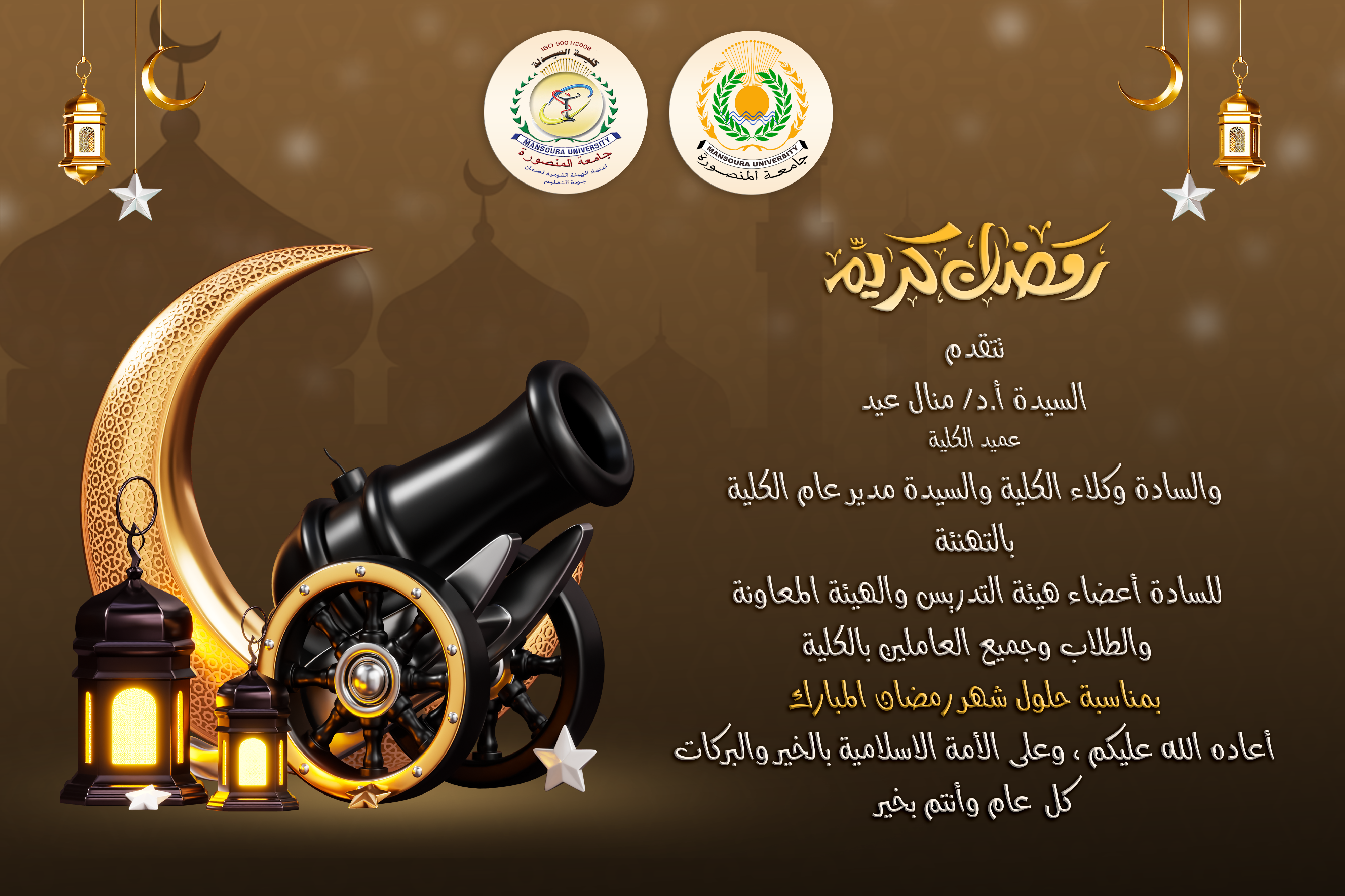 تتقدم السيدة الأستاذ الدكتور/ منال عيد – عميد الكلية والسيد الأستاذ الدكتور/ خالد بشير – وكيل الكلية لشئون الدراسات العليا والبحوث والسيد الأستاذ الدكتور/ هانى قناوى – وكيل الكلية لشئون خدمة المجتمع وتنمية البيئة والسيدة الأستاذ الدكتور/ جينى جيهان نصر – وكيل الكلية لشئون التعليم والطلاب والسيدة/ أمل عبد الجواد – مدير عام الكلية بالتهنئة للسادة أعضاء هيئة التدريس والهيئة المعاونة والطلاب وجميع العاملين بالكلية بمناسبة حلول شهر رمضان المبارك أعاده الله عليكم وعلى الأمة الاسلامية بالخير والبركات ،تقبل الله منكم الصيام والقيام وصالح الأعمال.