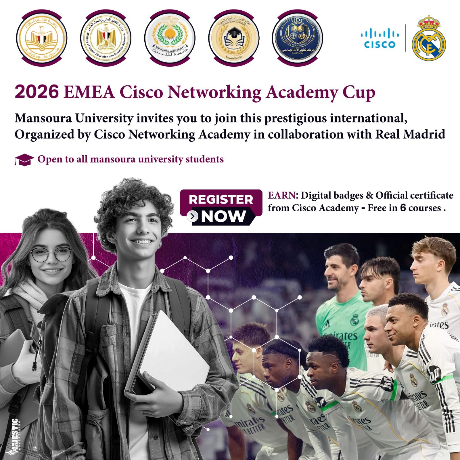 هذا، وتتيح المسابقة لمنتسبي الجامعة - (طلاب – باحثين – من يرغب من أعضاء المجتمع) - الاستفادة من واحدة من أقوى الفرص الدولية في مجال المهارات التقنية والتحول الرقمي، بالشراكة مع Cisco Networking Academy وبالتعاون مع Real Madrid، وبرعاية صندوق تطوير التعليم التابع لرئاسة مجلس الوزراء.